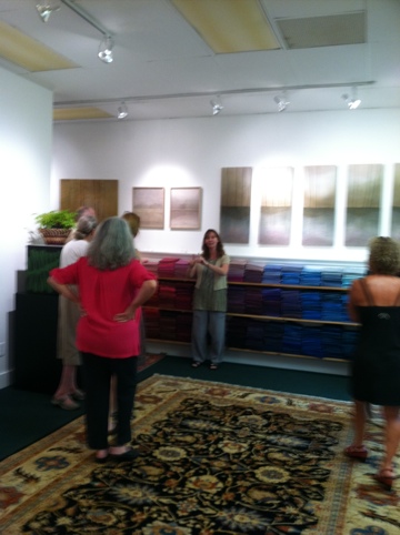 Karen Henderson speaks about her work during the Artist’s Walk-through — note also Rae’s beautiful stash of hand-dyed wool for rug-hooking.